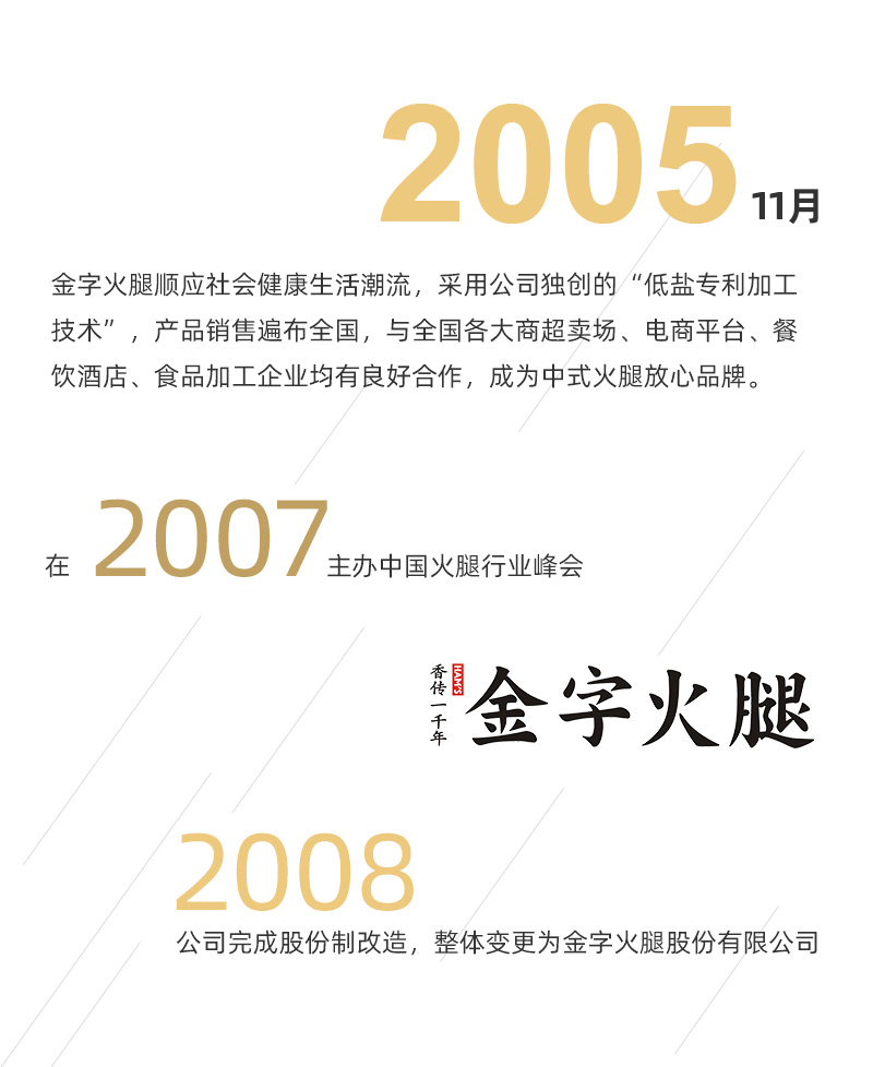 >金字火腿順應(yīng)社會(huì)健康生活潮流,采用公司獨(dú)創(chuàng)的“低鹽專利加工技術(shù)”,產(chǎn)品銷售遍布全國(guó),與全國(guó)各大商超賣(mài)場(chǎng)、電商平臺(tái)、餐飲酒店、食品加工企業(yè)均有良好合作,成為中式火腿放心品牌。