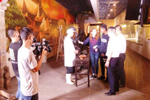 在《常中丞筆記》中,火腿叫做蘭熏,《東陽縣志》稱熏蹄,《本草求原》稱南腿,由此可觀,火腿此物名聲深遠(yuǎn),頗受眾人喜愛,不然也不會(huì)有如此多的“小名”。 10月17日這天,浙江經(jīng)視旅游節(jié)目《48小時(shí)》攝制組團(tuán)隊(duì)在中國火腿博覽館、世界火腿博覽館開始了“火腿”的探索之旅,從起源伊始談至繁華盛宴,期間故事種種萬千。 從中國火腿博覽館入口處的“百姓勞軍圖”便開始了這場對話。而在博覽館內(nèi)的火腿制作流程雕塑則完全將攝制組吸引,無論是考驗(yàn)刀工的制作火腿頭道工序——修胚,還是考驗(yàn)“鹽功”的——上鹽環(huán)節(jié),都深